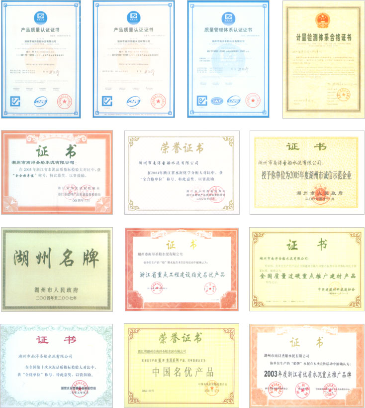 所謂榮譽 就是一種閃光的成長軌跡 回首溯源,在圣船公司發(fā)展的艱難歷程中,曾獲湖州市紅旗企業(yè),浙江省文明單位,浙江省先進(jìn)企業(yè),國家鄉(xiāng)鎮(zhèn)五星級企業(yè),國家鄉(xiāng)鎮(zhèn)環(huán)保先進(jìn)企業(yè),浙江省管理示范企業(yè)。公司的主導(dǎo)產(chǎn)品“船”牌42.2等級普通硅酸鹽水泥具有早期強(qiáng)度高,凝結(jié)硬化快,色澤青綠,澆制是混凝土耐磨性好,深受江、浙、滬一帶用戶的青睞,產(chǎn)品先后被評為市優(yōu)、省優(yōu)、部優(yōu),市名牌產(chǎn)品牌產(chǎn)品和省地方品牌產(chǎn)品名稱,公司在同行業(yè)中率先通過了水泥產(chǎn)品質(zhì)量保證,在浙江省水泥產(chǎn)品質(zhì)量行檢行評活動中榮獲“四連冠”,被中國水泥協(xié)會評為全國水泥質(zhì)量“推薦產(chǎn)品企業(yè)”,浙江省消費協(xié)會列為全省消費者推薦產(chǎn)品,浙江省質(zhì)量跟蹤產(chǎn)品,湖州市 質(zhì)量信用(誠信)企業(yè),湖州市誠信納稅企業(yè),省三優(yōu)企業(yè),浙江省優(yōu)質(zhì)水泥重點推廣品牌,浙江省重點工程建設(shè)指定名優(yōu)產(chǎn)品,中國建材工業(yè)發(fā)展研究突出貢獻(xiàn)獎!按迸粕虡(biāo)連續(xù)二屆被評為省、市著名商標(biāo),2001年,公司順利通過了IS09001:2000國際質(zhì)量管理體系認(rèn)證,2003順利通過IS0901:2001換版。